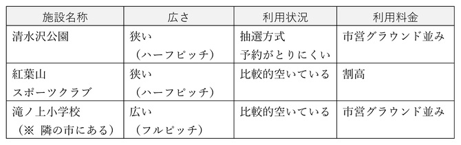 高宮:うちの実情としてはそう考えざるを得ないよね。金銭的負担を避けるために、優先順位をまず清水沢公園、次に滝ノ上小学校、両方とも取れなかったら紅葉山スポーツクラブ、という順にして、具体的にどこを予約するかは丸山さんに一任する、ということにしよう。