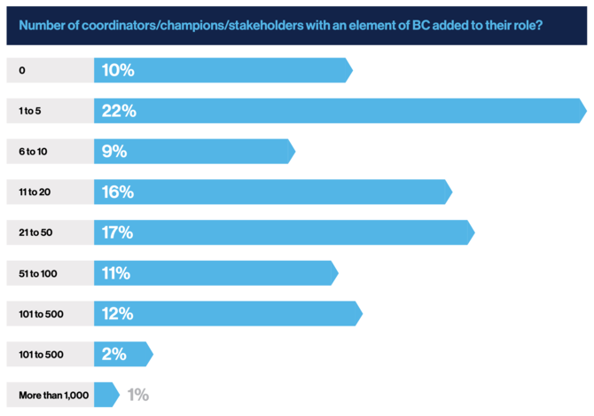 本報告書の最初に示されているデータは、事業継続の担当部署(Business Continuity team)に専任の従業員(Full Time Employees)が何人いるかを尋ねた結果であり、「1〜2人」という回答が50%を、「3〜5人」という回答が20%を占めている。別のデータでは回答者の大部分が従業員数1,000人以上の大企業に所属していることが示されているので、大規模な組織のBCMを少人数で運営されていることが多いということになる。