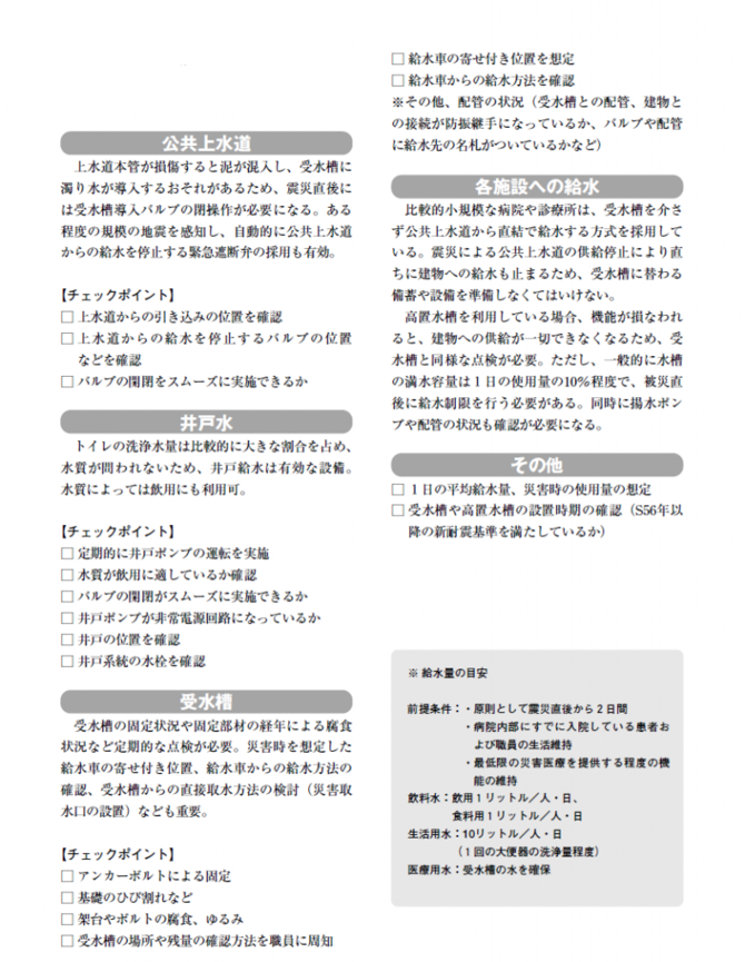 東京都福祉保健局が平成12年にまとめた「病院 の施設・設備自己点検チェックリスト」によると、 医療機関は日頃から、受水槽、高置水槽、配管バ ルブなど、水の供給に必要な施設・設備の点検を しておくとともに、平時に使う1日あたりの水の 使用量や災害時の節約可能量などについても確認 しておくことが重要としている。