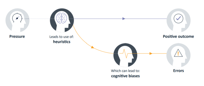 そこで、今回のブログでは心理学から学ぶポイントの一つ、認知バイアスに焦点を当ててみます。その基本的な概念は、次のイラストの通りです。人はプレッシャーを受けて判断を急かされると、つい経験則や直感に頼って(「ヒューリスティックな」)判断をしてしまうのです。上手くいけば首尾よく正解となりますが、大抵の場合、「バイアス」によって不正解に導かれてしまう、ということになります。