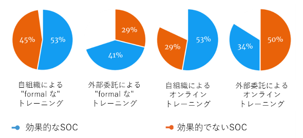 図1 はそのような比較の一例である。他の調査項目において効果的な SOCの方がトレーニングの頻度が高いことが示されているが、図1はそのトレーニングの方法について分析している。「formalな」トレーニングがどのようなものを指すのか、具体的な記述がないが、オンライントレーニングと比較されていることから考えると、恐らくセミナールームなどでの研修を指しているのであろう。この図を見た限りでは、効果的でないSOCでは、オンラインかつ外部委託による(つまり、より低コストな方法の)トレーニングが多く実施されているようである(注 3)。