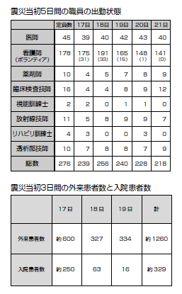 冊子には、震災当初から3日間で約1260人の外来患者があり、震災前からの入院患者に加え、新たに3日間で329人の入院患者が出て、各病棟の談話室、廊下などのスペースに簡易ベッドを作り患者を収容したことなど発災直後からの様子が、詳しく描かれている。