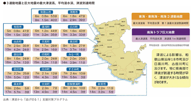 南海トラフに近い紀伊半島は、地震発生から津波到達までの時間が短いという特性がある。和歌山県沿岸部は東海・東南海・南海3連動地震が起きた場合、最も短い地域で津波到達まで5分、最大クラスの巨大地震の場合は最短3分だ。逃げ切ることができない「津波避難困難地域」がどうしても発生する。