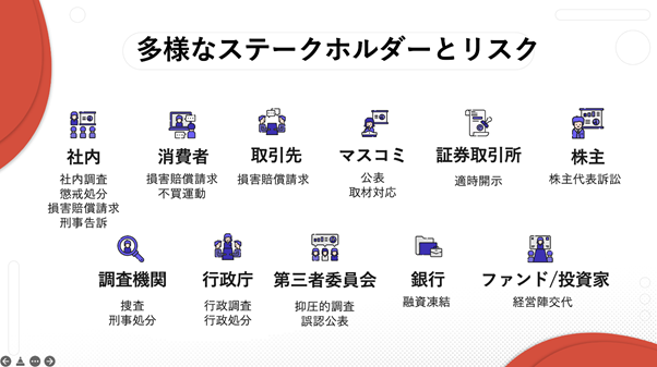 企業においても有事の際は、登場する全てのステークホルダーを抽出、対応のために必要な情報、対応の手順等を管理する「マルチステークホルダーマネジメント」が求められる。さらに限られた状況下で優先順位を判断し、一定の成果・効果を取捨選択するプライオリティジャッジメントが必要になる。