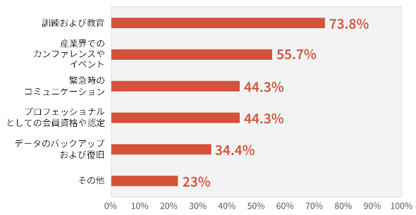 図1は、事業継続のための対策としてどのような投資を検討しているかを尋ねた結果であり、教育及び訓練がトップとなっている。また「産業界でのカンファレンスやイベント」での情報交換やネットワークづくりが2位となっているのも興味深い(注2)。「プロフェッショナルとしての会員資格や認定」が4位に入っているというのは、恐らくBCI(注3)やDRII(注4)、RIMS(注5)のような会員制組織の認知度が高い北米からの回答が多いためであろう。