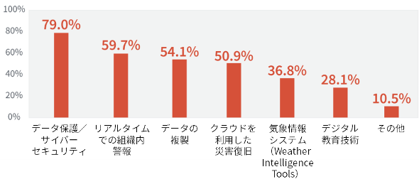 また図2は、事業継続に関連してどのようなテクノロジーに投資しようとしているかを尋ねた結果である。情報システムのデータ保護や復旧に関する回答が多いが、それらの中で警報や教育のためのシステムの導入が検討されていることは注目に値する。