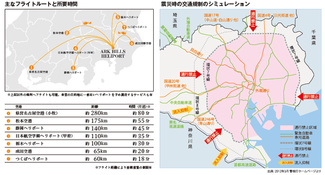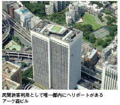 「震災対策フライトプラン」は、東京・赤坂のアークヒルズ・アーク森ビル屋 上にあるヘリポートから、ユーザーが 希望する場所ヘ輸送する。席数は5席 (カーゴスペースには L サイズのスーツケース4個程度が搭載可能) 。