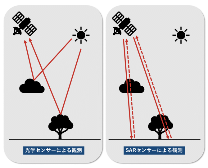 その中でもSAR(合成開口レーダー:Synthetic Aperture Radar)の利用が拡大しています。SARはセンサーから電波を発射し、その反射をとらえることで対象物を計測するため、夜であっても、悪天候で雲がかかっていても変わらず観測することができます。そして、使用する電波の波長を変えることにより、地表の様子、地下水、地下鉱物の分布などさまざまな対象を計測することができます。技術革新によって小型軽量化が進み、低コストの小型衛星にも搭載することができるようになったため、スタートアップ企業が多く参入し、ビジネスとしての展開に取り組んでいます。