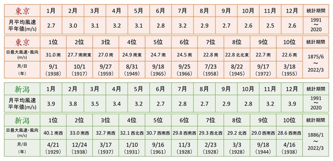 これに対し、新潟では、風速に関して東京と異なる様子が見られる。風速の月別平年値は冬季が年間最強であり、平均的には冬の季節風が強いことを物語る。ただし、日最大風速の極値(歴代1位)は、温帯低気圧によって春(4月)に記録されたものである。日最大風速の上位10事例の内訳は、冬(12~2月)が3事例、春(3月、4月)が4事例、秋(9月)の台風によるものが2事例、晩秋(11月)の温帯低気圧によるものが1事例となっており、春は暴風の吹きうる季節であることが分かる。