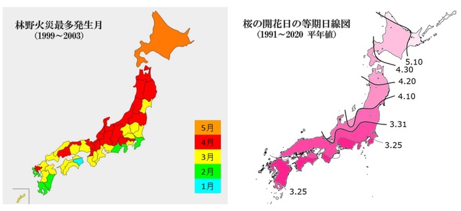 桜が花咲く頃に林野火災が多いのは、空気が乾燥し強風が吹く時期であるという気象条件のほかに、残雪の消えた野山の地表に、燃えやすい枯れ葉や枯れ草がたくさんあり、しかも山菜とりや作業などで人々が山林に入るという火災の危険因子が重なることが関係している。