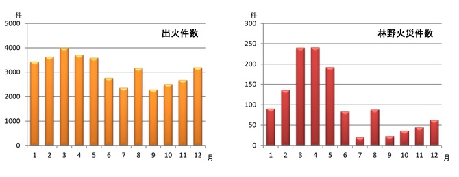 春は年間で最も火災の多いシーズンである。図1に、最近の5年間平均の火災統計を示す。火災は冬に多いというイメージがあるかもしれないが、最近5年間の平均では、月別出火件数(図1左)が冬より春に多くなっている。そして、林野火災件数(図1右)に限れば、その傾向はより顕著で、3月から4月にかけて、はっきりとしたピークがみられる。