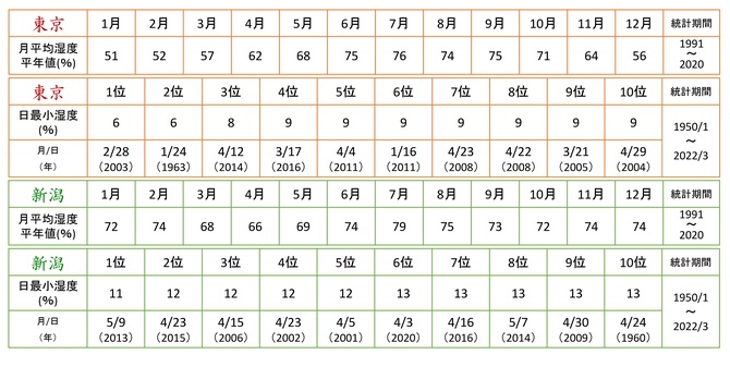 まず、表1で湿度の平年値を見ると、新潟では春(3月~5月)の月平均湿度が年間で最も低いが、冬に「空っ風」の吹く東京では、春よりも冬(12月~2月)の湿度のほうが低くなっている。しかしながら、東京における日最小湿度の歴代順位を見ると、第1位と第2位は冬(それぞれ2月、1月)に記録されているものの、第3位には春(4月)が食い込んでいる。第4~10位には同じ値が並び、その7事例のうち6事例は春(3月または4月)に記録されたものである。ちなみに、歴代順位の統計では、値が同じものを同順位とせず、発現日の新しいものを上位とするルールになっている。