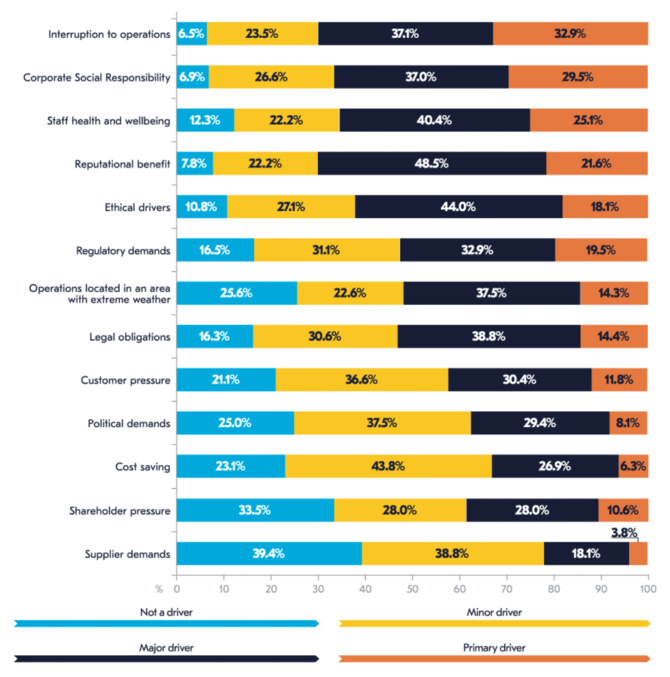 これらに比べると、規制による要求(Regulatory demands)や法的義務(Legal obligations)、顧客からの圧力(Customer pressure)はやや劣後している。このような状況からは、多くの組織が気候変動リスクに対して、外圧に屈する形ではなく自発的な意思決定として取り組んでいるという姿勢がうかがえる。
