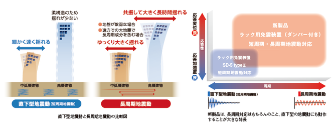 通常の地震の多くは直下型地震で、周期的には細かい震動が特徴だ。この短周期地震動に対応した免震装置がSD-5typeⅡで、装置の上に乗せたサーバ機器などを地震などの揺れから保護している。