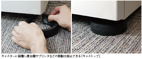 特に、複合機やプリンタなどのOA機器のキャスターに装着して、地震の時にも移動を抑止する「キャストップ」は、本体を動かすことなく装着できる簡便さと、時にも実証された安全3.11性で、高い評価を得ている。