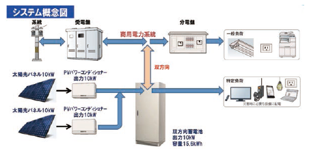 さいたま市に導入される太陽光パネルは21kW、リチウムイオン電池の容量は15.6kWh。蓄電システムESSP7000シリーズは、この15.6kWh以外にも23.5kWh、31.3kWhのラインアップを持つ。入出力電圧は高圧受電契約のない施設でも系統連系できる単相3線AC200V。システムを並列利用することでさらなる大容量化にも対応する。