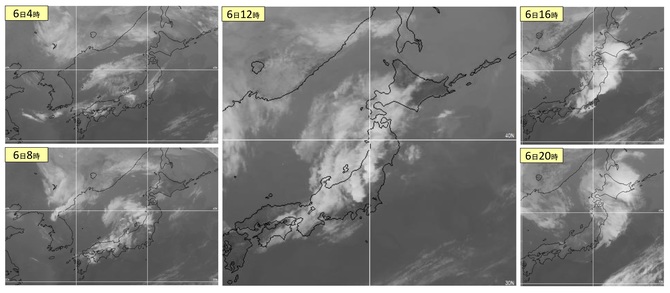 6日20時には、この雲域は房総半島付近から三陸沿岸、北海道を経て、オホーツク海南部にかけて南北にのび、16時間前の最初の画像に比べると幅がかなり広がった。これは、このじょう乱が単なる積乱雲の集合体でなく、低気圧に伴う雲域として組織化していることを示す。