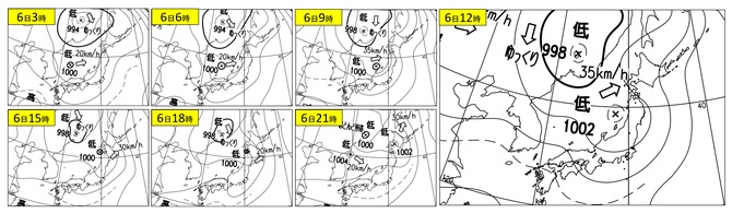 図1の気象衛星画像からは、細長い形をした気象じょう乱が本州付近を通過したことがイメージされるであろう。しかし、当日気象庁から示された地上天気図は、その期待を裏切る。図2に、気象庁が公表した3時間間隔の7枚の速報天気図を並べた。速報天気図は、観測時刻の約2時間後に公表される。図2においても、6日12時の図を他の時刻より拡大している。