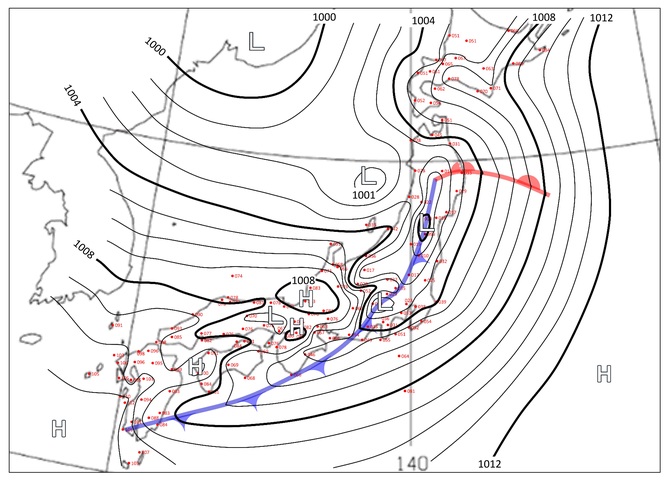 図3によれば、本州付近は東北地方から関東、東海地方を経て、西日本の太平洋側にかけて、鋭い気圧の谷になっていることが分かる。それは、一言で言えば、寒冷前線とみなしてよいものであるが、図2にはそれが示されていない。このような相違は、解析者の現象理解の相違に起因しており、どちらが正しいと決めつけることは危険であるが、描かれた図から得られる情報は大いに異なる。筆者が「間の抜けた天気図」と呼ぶのはそういう意味からであり、そのような図を真に受けると大変なことになる。