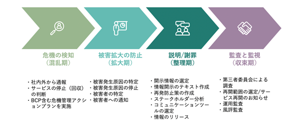 リスクが顕在化した時、準備と対応次第でレピュテーションを向上できる場合がある。そのためには社会に必要とされる企業としてのスタンスを、多様なステークホルダーに的確に発信することが必要だ。レピュテーションコントロールを適切に行うためには、危機が発生してからの対応を、①危機の検知(混乱期)②被害拡大の防止(拡大期)③説明/謝罪(整理期)④監査と監視(収束期)の4つのプロセスに分けて対応することが望ましい。