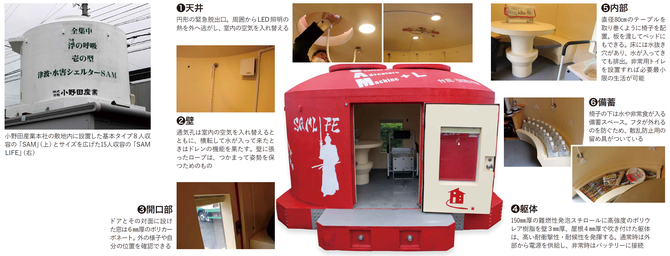 「先日納入した徳島県の方は、身体に障がいのある方。『もし津波が来たら死んでも仕方ないとあきらめていた。でも、これ(SAM)でやっと、自分は助かってもいいんだと思えます』といって喜んでくれました。その方は普段もシェルター内で仕事をしています」。開発・製造・販売を行う小野田産業の小野田良作社長はそう話す。