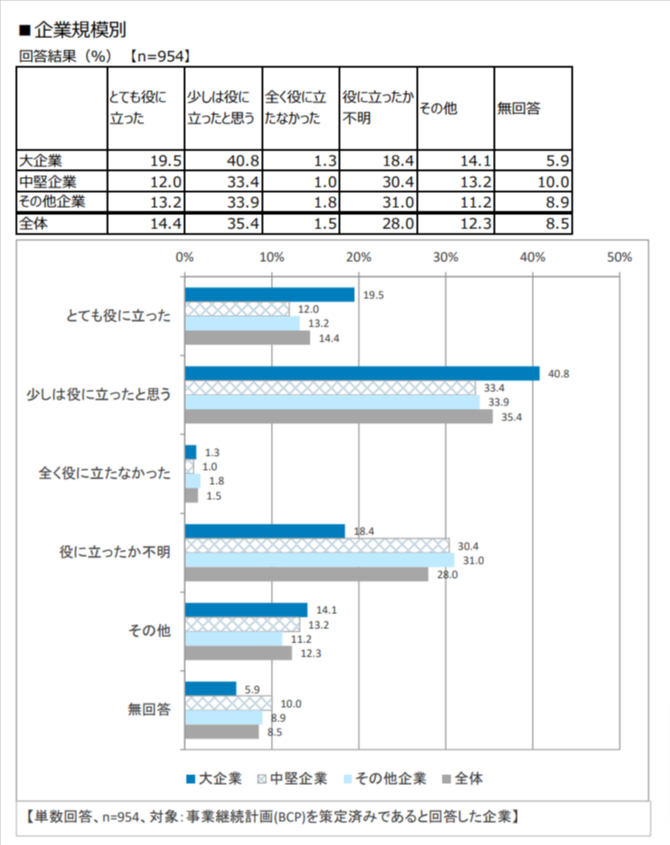 今回の調査に使われた質問の原文を見ると、「近年の自然災害で被害を受けた際、BCPは役に立ったか」とある。サンプル数は全回答のうち、BCPを策定していていると回答した954社。回答は、1.とても役に立った、2.少しは役に立ったと思う、3.全く役に立たなかった、4.役に立ったか不明、5.その他、の5段階から当てはまるもの1つを選ぶリッカート方式がとられている。
