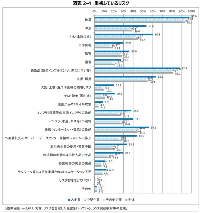 今回の調査が実施されたのは、令和4年1月7日(金)~2月14日(月)。したがって、ロシアのウクライナ侵攻も、3月22日の需給ひっ迫警報も調査時点では予測できるものではない。その前提も踏まえて、企業が重視していると回答したリスクを見てみよう。