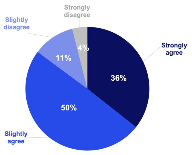 図1は、「自社のサプライヤーは特定の地域に集中しすぎていることを懸念している」という文に対して同意するかどうかを尋ねた結果である。「強く同意する」(Strongly agree)と「多少同意する」(Slightly agree)とを合わせると、回答者の86%が、サプライヤーが特定の地域に集中しすぎていることを懸念しているということになる。