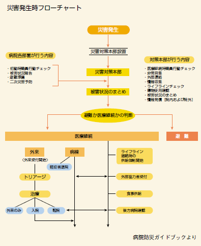 今 が災害における平穏期であることを認識して早く準備に取り掛かることです。スタッフ一人ひとりが、災害が起きたときにそれぞれ何をすればいいのかというこ とを把握できているかにつきます。今いる患者さんの安全を守る、外から入ってくる傷病者のトリアージをする、備蓄品の状況を確認する…、すべてが抜け落ち てはいけない大事なことです。それらを達成するには、あらかじめスタッフの役割分担を決めておかなくてはなりません。一方で、災害対策本部はすべてのス タッフが、決められたポストについて、抜け、漏れがないかを迅速に確認することが求められます。