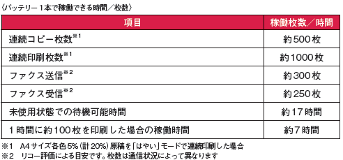 バッテリーは、14.4V、4700mAh、68Whと一般的なノートパソコンの大容量バッテリー同等のリチウムイオン電池を搭載。1時間に100枚印刷したとして約7時間の継続稼動が可能だ。バッテリーは交換が可能で、別売のバッテリーとバッテリーチャージャーを導入すれば、あらかじめ予備バッテリーをストックし本体とは別で充電しておくことで、さらに稼働時間を延ばすことも可能だ。