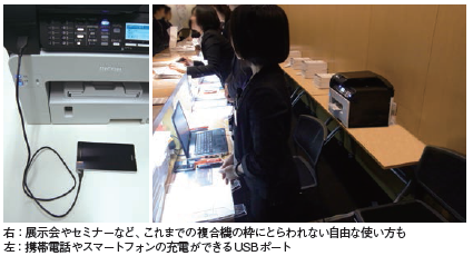 停電対策とは別に、新しい使い方も広がり始めた。例えば、展示会やフェア会場、イベント会場に持ち込めば、電源ケーブルの配線が難しい場所でもコピー・プリンター・スキャナーとして利用できる。無線LANにも対応で、ワイヤレスでプリントアウトすることが可能なため、これまでの複合機の枠に捉われない自由な発想での使い方を実現できるのだ。