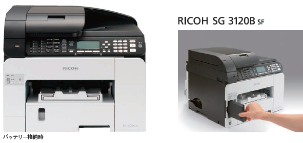リコーは2004年からビジネス用インクジェットプリンター「GELJETプリンター」を販売しているが、このGELJETプリンターの技術を応用した製品がインクジェット複合機「RICOH SG 3120B SF」だ。同複合機は停電対策の悩みを解決する切り札となる。最大の特徴は、リチウムイオンバッテリーを標準で搭載し、突発停電が発生しても電源の瞬断なくバッテリー稼動に切り替わるため、普段通りに業務を継続することができる点。