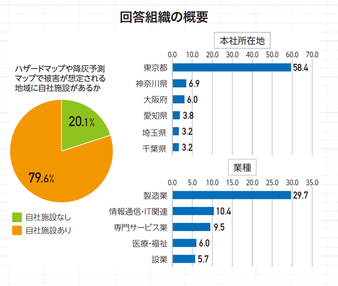 回答組織の本社所在地は、東京都内が58.4%と突出して多く、神奈川県6.9%、大阪府6.0%が続いた。山梨県は1.9%、静岡県は2.5%だった。業種は製造業が29.7%で最も多かった。