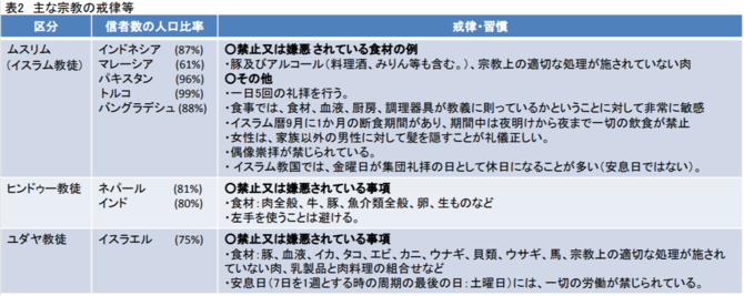 外国人労働者の定着を目指す企業では、外国人労働者やその家族に対する健康面や生活面でのサポートを目的とする取組み(福利厚生)として、住居のあっせんや借上社宅の提供、社員寮の設置などを行っています。また、宗教や文化の違いを配慮した取り組みとして、社員食堂でハラール(イスラム法において合法なもの)の食事を提供したり、メニュー表に豚肉・牛肉の使用状況を英語やイラストで表示したり、外国人労働者の入居施設の隣にハラール認証を取得した多国籍レストランを開設することにより夕食にも配慮している事例があります。総務省が平成29年12月11日に公表した「宗教的配慮を要する外国人の受入環境整備等に関する調査―ムスリムを中心として―の結果」では、こうした外国人労働者の食事や礼拝に配慮した企業の取り組み例のほか、宗教上の戒律・生活習慣について、特に制約が多いイスラム教、ヒンドゥー教、ユダヤ教の戒律や習慣をまとめた表が参考資料として添付されており、外国人労働者の福利厚生を検討する企業にとって、大いに参考になるものと思われます。