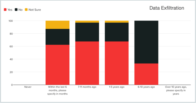 まず、ランサムウェアの被害にあった経験がある回答者のうち、実に約6割が情報を盗み出されたと答えている。図1はランサムウェアの被害にあった回答者に対して、情報の盗難があったかどうかを尋ねた結果である。回答結果はその被害にあった時期を横軸として整理されているが、これを見るとデータを盗み取られたというケース(図の赤色の部分)が、5年前を境に40%弱から 60%強に急増していることがわかる。