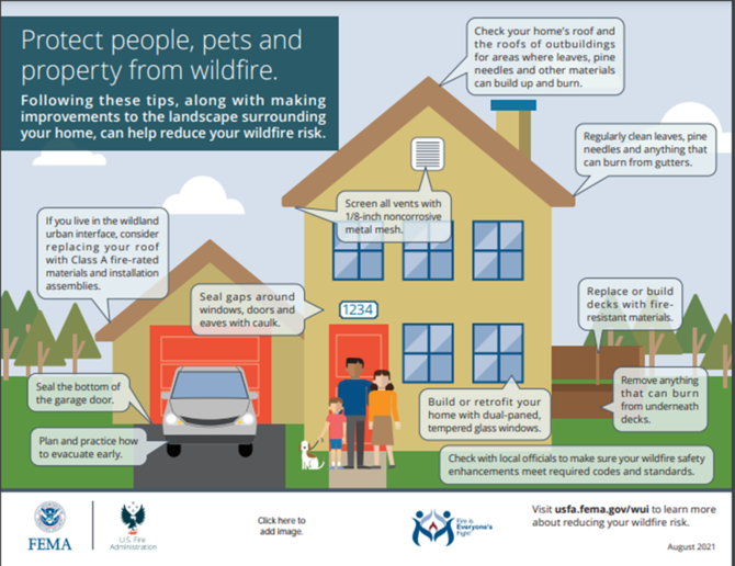 下図は山火事リスクのある地域住民に向けた住宅の防災対策です。このほかにも、FEMAでは山火事対策について図を用いた対策を紹介しています。