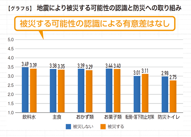ところが、自宅が被災するかどうかとの認識は、水・食料の備蓄や、防災用トイレの備えとは、ほとんど相関がないことが分かった【グラフ5】。つまり、自宅が被災すると感じていても、その結果が防災活動に結びついていない。