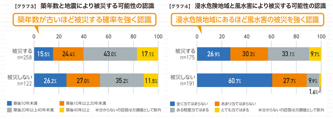 結果は、築年数が10 年以上の古い家に住んでいる人ほど被災する可能性があると考え、浸水の危険地域に自宅があるという人ほど、風水害で被災する可能性があると考えている傾向が明らかになった【グラフ3】【グラフ4】。