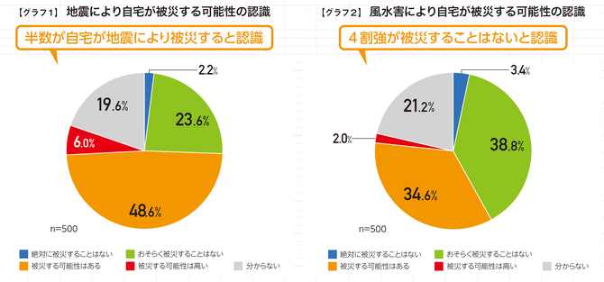 アンケートでは、地震や風水害により、自宅が被災する可能性をどの程度感じているかを聞いた。その結果、地震によって、自宅が被災する可能性については「絶対に被災することがない」「おそらく被災することがない」との回答が合わせて25.8%となった。