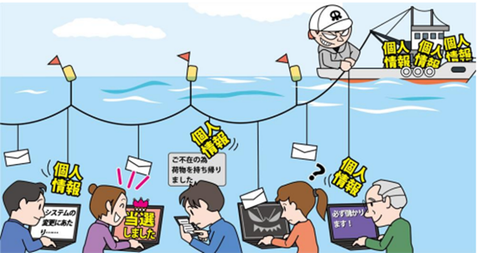宅配便の不在通知を装ったSMS(ショートメッセージ)やメールを送信してニセサイトに誘導し、ウイルスに感染させたり、ID・パスワード等を入力させて、個人情報を盗む手口です。
