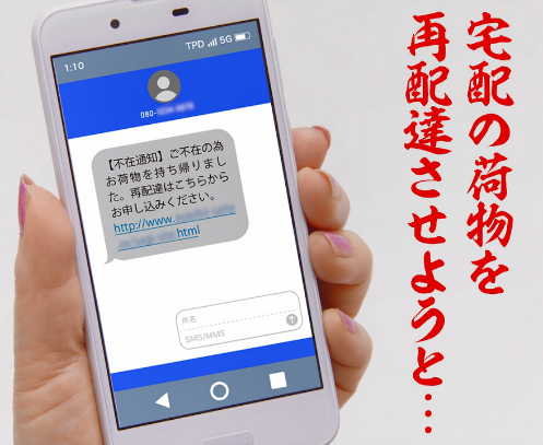 ニセの不在通知SMSやメールを受信し、記載されているURL(アドレス)にアクセスすると、宅配便業者を装った再配達受付のニセサイトに誘導されます。