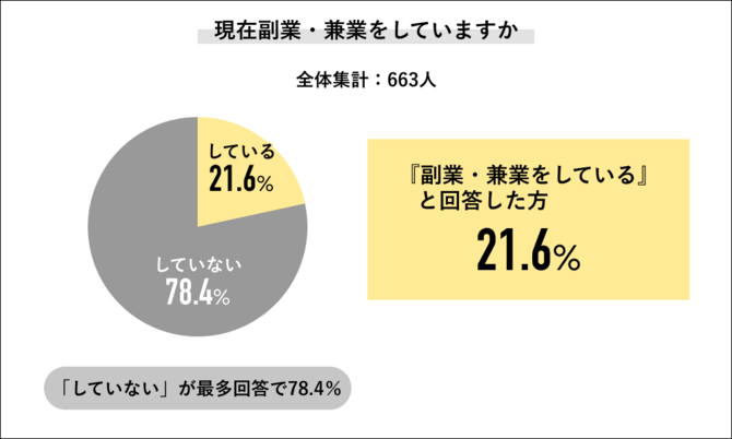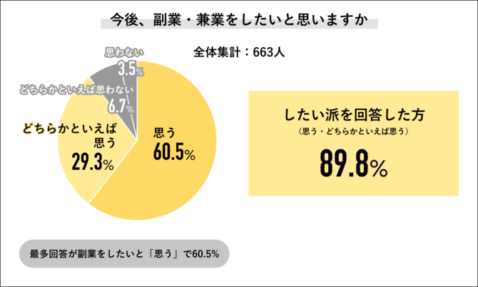 JOB総研が実施した「2022年副業・兼業に関する実態調査」によると、副業・兼業をしていると回答した人の割合は21.6%で、2020年以降、副業・兼業を始める人が急増しています。同調査では、副業・兼業を始めたきっかけについて、「本業の収入だけでは生活が厳しくなった」「テレワークになり始めやすくなった」を挙げる人の割合が高く、また、今後副業・兼業をしたいと思うかとの問いに対して「思う」「どちらかと言えば思う」と回答した人の割合は89.8%に上っています。