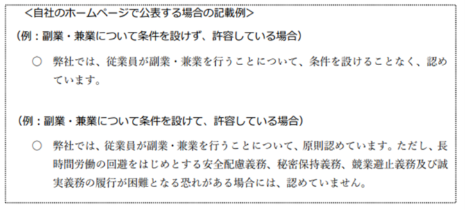 令和4年7月の改定では、企業による副業・兼業に関する情報の公表に関する事項が追加されました。働き方が多様化する中で、副業・兼業を希望する労働者が適切な職業選択を通じ、多様なキャリア形成を図っていくことを促進することを目的として、「企業は、労働者の多様なキャリア形成を促進する観点から、職業選択に資するよう、副業・兼業を許容しているか否か、また条件付許容の場合はその条件について、自社のホームページ等において公表することが望ましい」とされています。また、副業・兼業ガイドラインのQ&Aでは、自社のホームページで公表する場合の記載例が示され、ホームページ以外の公表方法として、会社案内(冊子)や採用パンフレットが挙げられています。