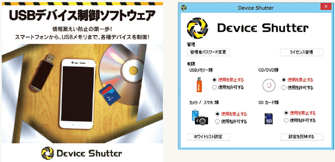 株式会社ディー・オー・エスが発売する「Device Shutter(デバイスシャッター)」は、機密情報や個人情報、マイナンバーなど、社内に保有している重要な情報の漏えい防止対策のソフトウェア。USBデバイス、USBメモリ、光ディスク(CD/DVDなど)、SDカード、デジカメ、スマートフォンなど、外部に接続される記憶デバイスの使用を制限することで、セキュリティレベルの高い事務環境を実現する。