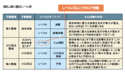 気象庁では、火山活動の状況を、噴火時などの危険範囲や必要な防災対応を踏まえて警戒レベル1(平時)から5(避難)までの5段階に区分している。予知が極めて難しい地震災害と比べると、火山の噴火は、傾斜計やGPSにより多角的に観測されていることから、比較的に事前に前兆をとらえやすいと言える。そこで、同社では、この警戒レベルに合わせて、BCPのトリガー(発動基準)を設定。具体的には、警戒レベル3の「居住地域の近くまで重大な影響を及ぼす噴火が発生、あるいは発生すると予想される」状態になったら、災害対策本部を立ち上げるとともに、原則として全社員が自主的に会社に集まることにしている。