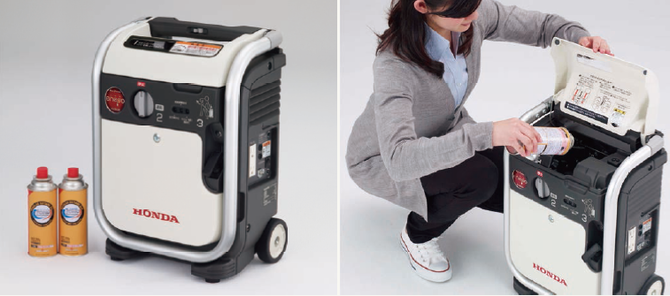 本田技研工業株式会社(HONDA)が開発した発電機「エネポ」は、鍋や焼き肉をするときに使う卓上カセットこんろ用のカセットボンベで動く。専用の容器が必要なガソリンと違い、持ち運びやすく、手軽に扱うことができる。一般的なカセットボンベのため、自宅での保管も楽だ。ちなみに、ガスボンベ内部のブタンガスは変質しないため使用期限はないという。メーカーでは「古い容器を使用する場合はサビの有無を確認し、サビが発生している場合はその部分からガス漏れがないことを確認してなるべく早く使い切ってほしい」としている。