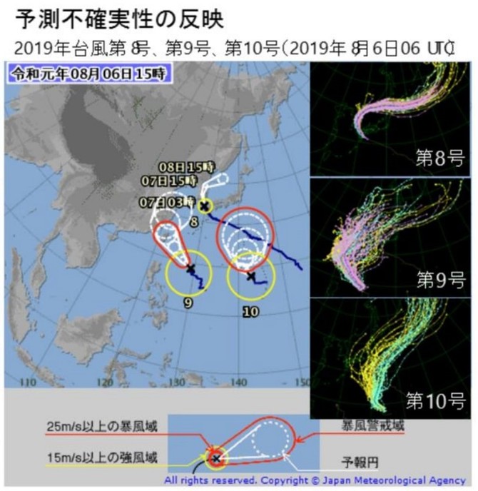 下の図は2019年の台風8号、9号、10号の予報円(点線の丸)とそれぞれの台風に対応するアンサンブル予報のメンバーを並べたものです。図の右側にあるアンサンブル予報の中で最もばらつきが小さいのは台風8号です(図右側の上段)。この先の台風の進路に関して信頼性が高いので、それに対応して図左側にある予報円も一番小さく表示されています。台風9号(図右側の中段)の場合、各メンバーの予測を見ると最初は皆同じような傾向を示していますが、その後花束が広がるように計算結果がばらけています。このため、目先の予報円は小さいものの、先の時間になると予報円は大きくなっています。台風10号(図右側の下段)の場合はどうでしょうか。これは目先の時間帯に近いところから各メンバーがさまざまな予測を弾き出しています。こうした場合は台風がどこに向かうか絞り込めないため、目先の時間帯から予報円が大きく表示されます。