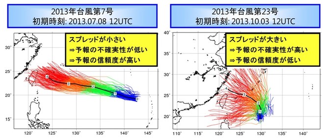 アンサンブル予測を見て情報を読み取る場合には、各予測のばらつき(スプレッド)が大きいか小さいかに注目します。ばらつきが小さくまとまっているとき(上の図の左側)は統一的な見解が出来上がっているイメージで、より信頼度が高い情報であることを示します。逆にばらつきが大きいとき(上の図の右側)にはどこに台風が向かうかはっきりしないので、予報の不確実性は高く、信頼度が低いものになります。