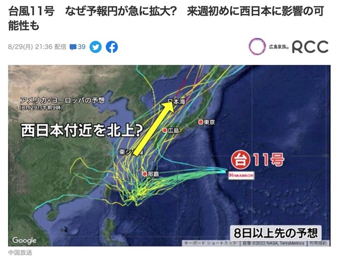 日本の気象庁は、台風や台風に発達する見込みの熱帯低気圧について現在5日先までの予報を提供しています。2019年までは3日先までの予報しか発表されておらず、熱帯低気圧の情報に至っては2020年までは24時間先までしか提供されていませんでした。このため、5日先の情報が入手できるようになったことは大きな一歩であったのですが、「もっと先の予測があればぜひ参考にしたい」と思われている方も多いかもしれません。そのようなニーズを満たすために、報道機関や民間気象会社などは海外の気象機関による台風予測の結果を紹介する形で5日先以降の傾向を示す例があります。2022年台風11号の際にもそうしたニュースや配信記事を見かけました(下図参照)。こうした場面で引用される図にはアンサンブル予報と呼ばれる手法で導き出された予測が反映されています。そこで今回の記事では、アンサンブル予報に関する基本的な知識をまとめていきます。また、海外の台風予測を自分で確認できるウエブサイトの例として、GPV WeatherやReal Time Tropical Cyclonesを紹介します。