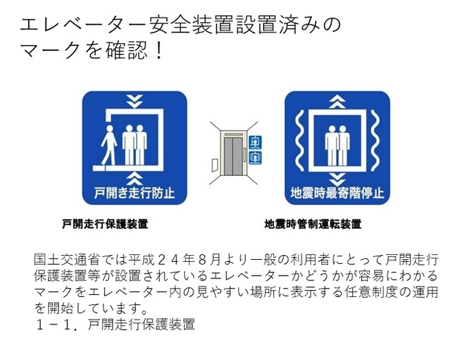 「地震時管制運転装置」がついていない旧式のものは閉じ込められる可能性が高いです。ただ、「地震時管制運転装置」がついていても上記マークが必ずついているわけではありません。マークは任意です。